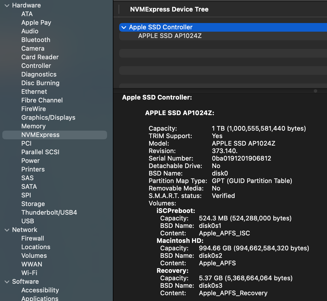 I confess this confuses me a bit, because i was under the impression that NVME is designed for PCIe bus devices, whereas the “Physical Connection” listed for the NVME controller is “Apple Fabric”.