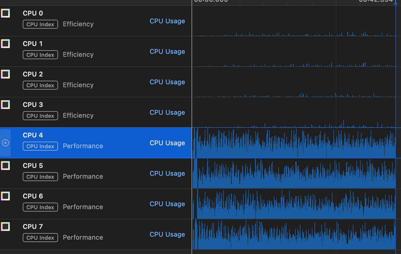Since the program is CPU bound it’s not too suprising that it seems to be running exclusively on the performance cores. What might be suprising is that the two threads we started seem to be running on all 4 performance cores.
